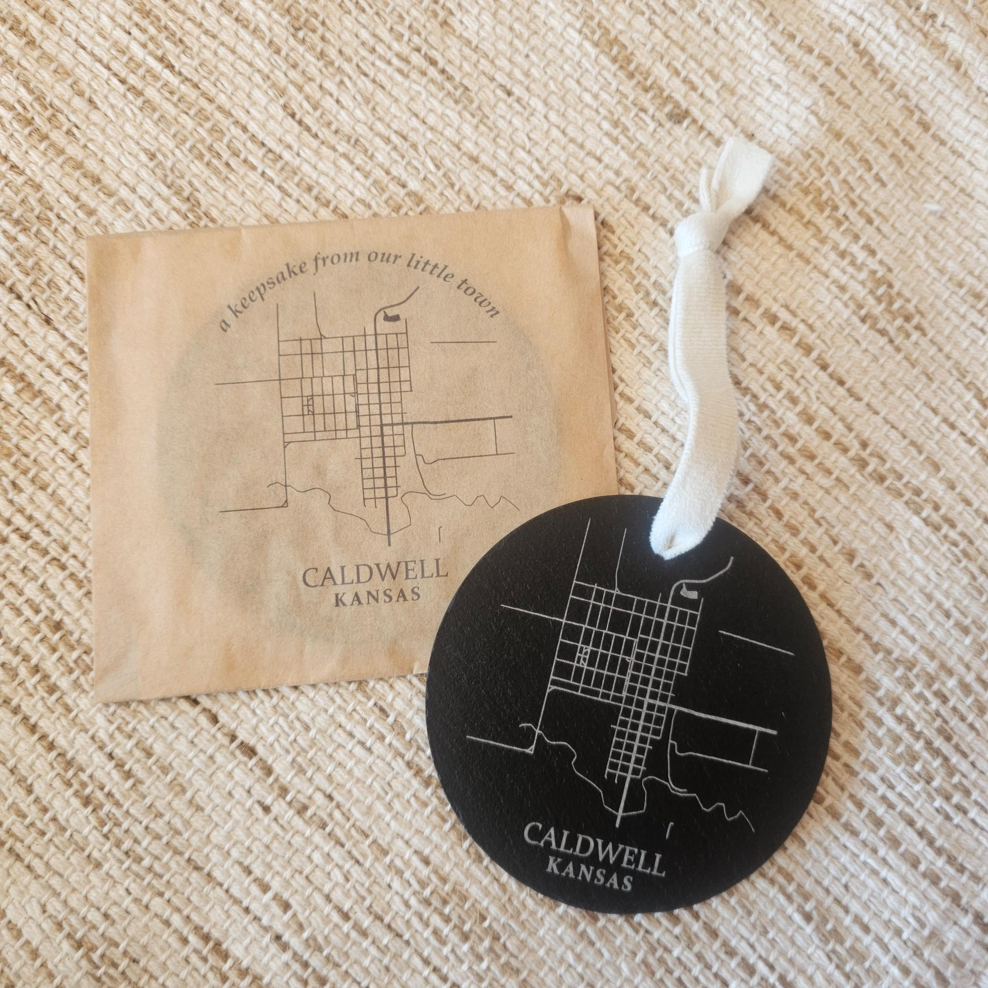 Each City Ornament is engraved with a simple map of Caldwell, Kansas — a timeless nod to the place we call home. Crafted on smooth slate with a soft, natural-tone ribbon for hanging, this piece brings a touch of local charm to your tree, shelf, or gift wrap.